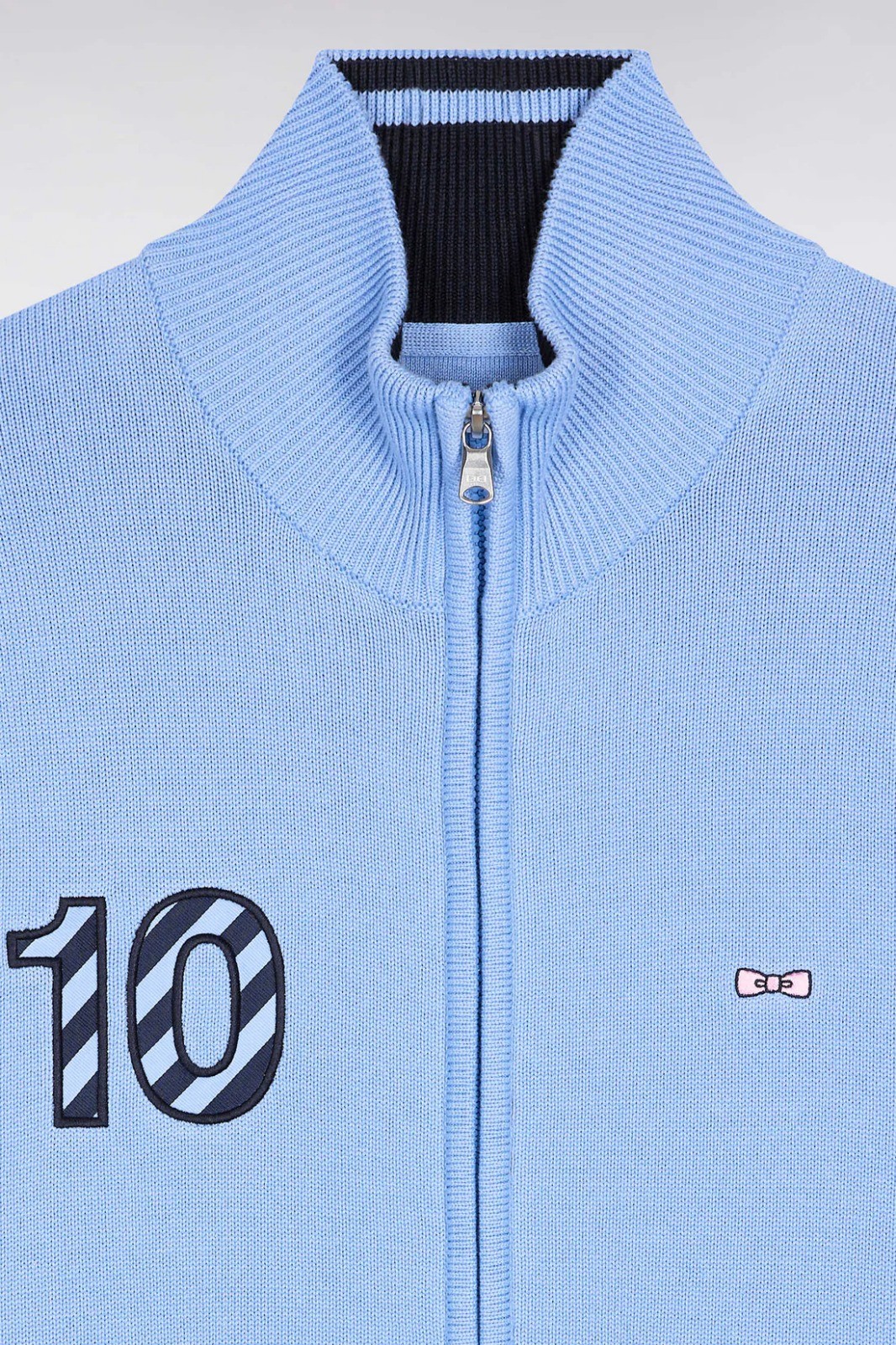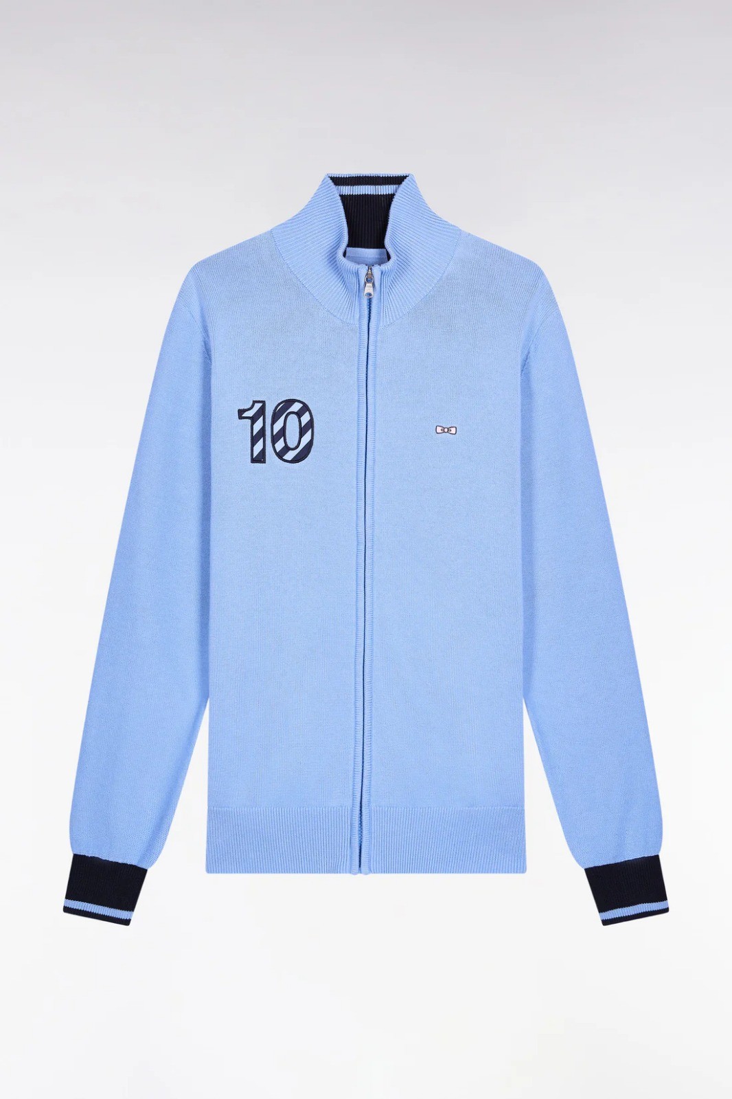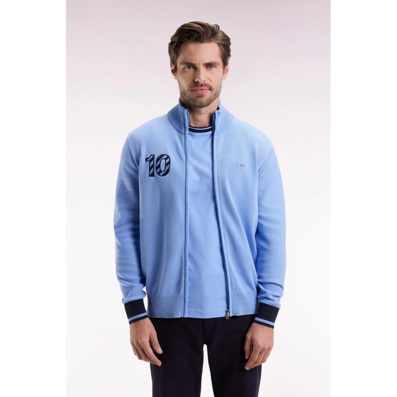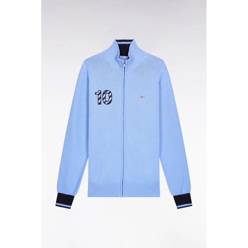 Ce cardigan Eden Park en coton zippé incarne l’élégance sport-chic grâce à ses jeux de textures entre point jersey et jersey envers. Son col montant, ses finitions bords-côtes et son liseré contrasté apportent confort et style. La broderie chiffre 10, rehaussée d’un tissu cravate, ainsi que l’emblème nœud papillon signent cette pièce unique. Idéal pour un look moderne et raffiné au quotidien.
