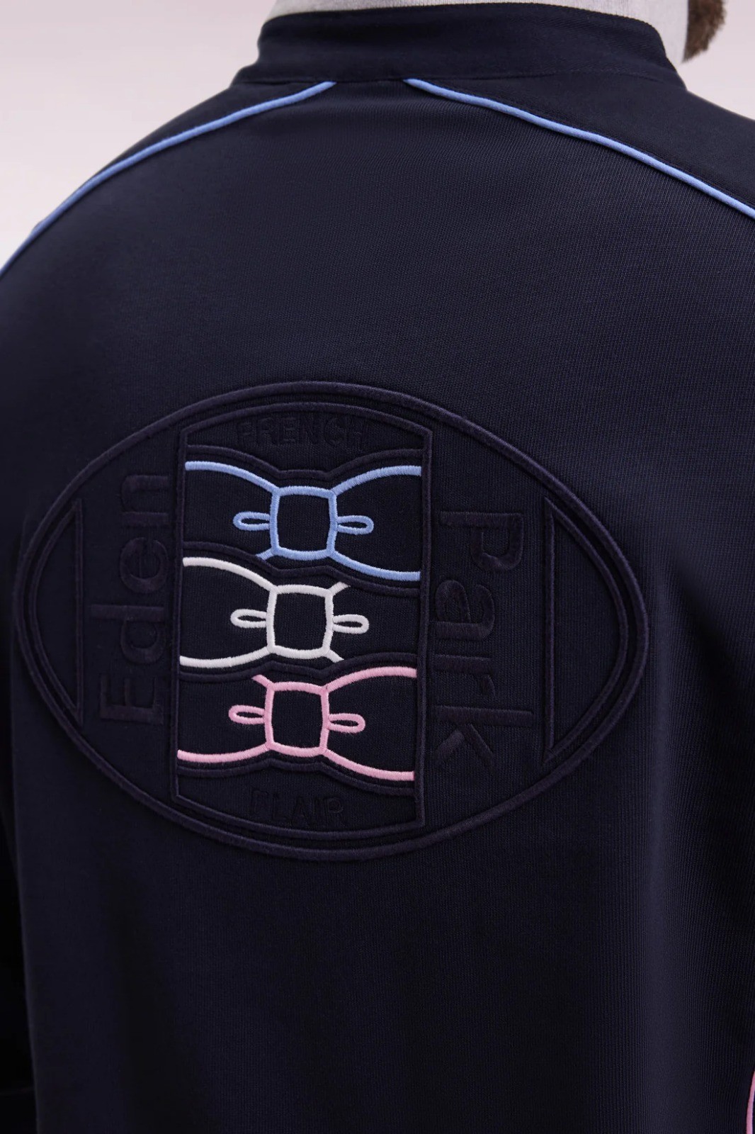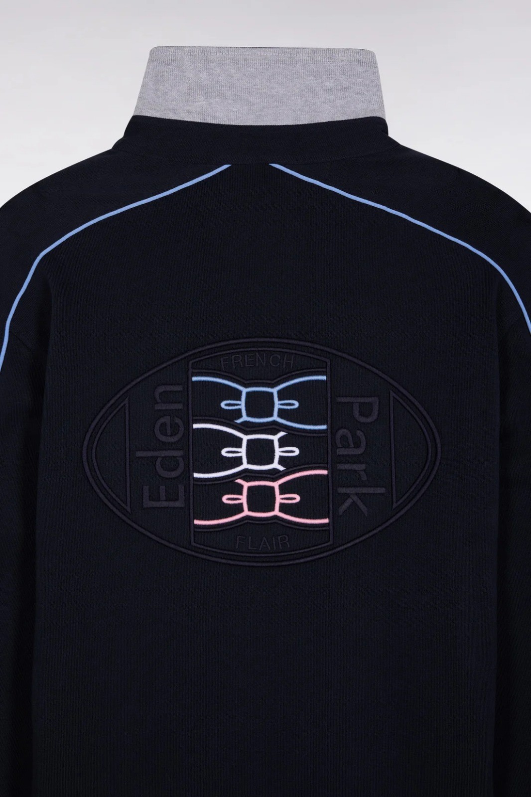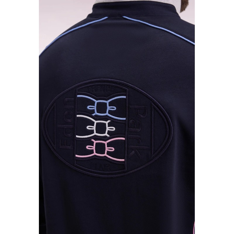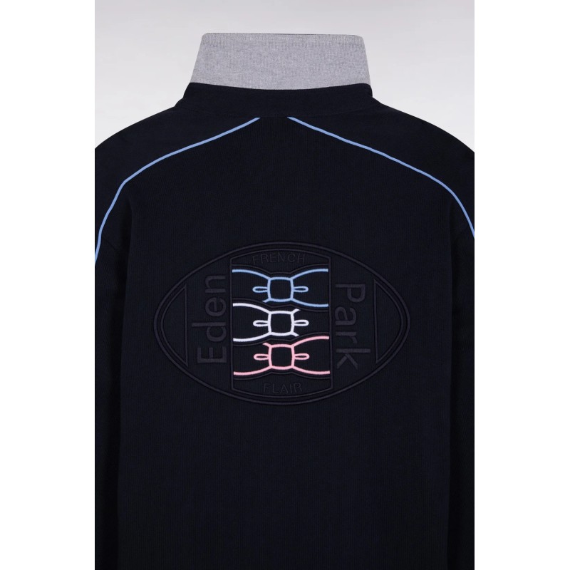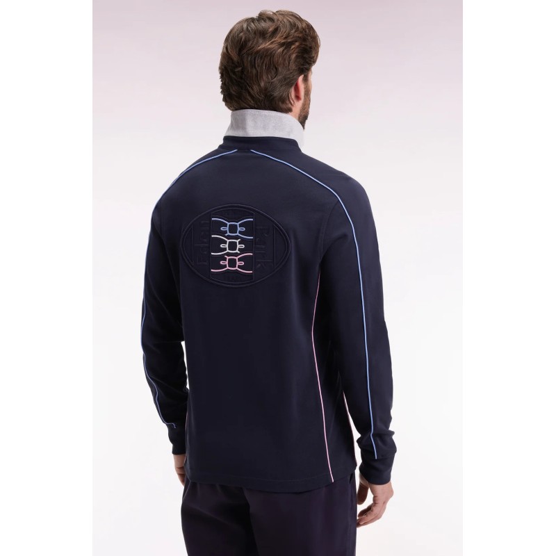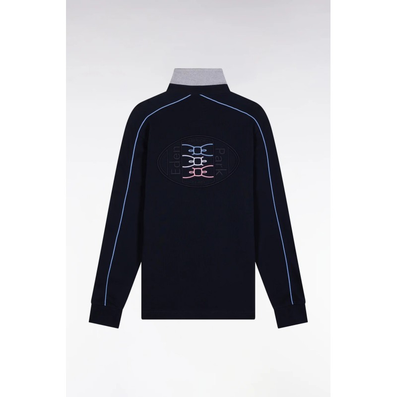 Ce maillot Eden Park à manches longues en jersey de coton épais incarne l’élégance sport-chic. Son col en twill avec revers en maille bords-côtes grise apporte structure et confort, tandis que les passepoils colorés soulignent la broderie dos en relief pour une touche graphique raffinée. Les poignets resserrés et les finitions soignées en font une pièce forte, idéale pour un look moderne et intemporel.