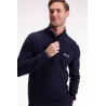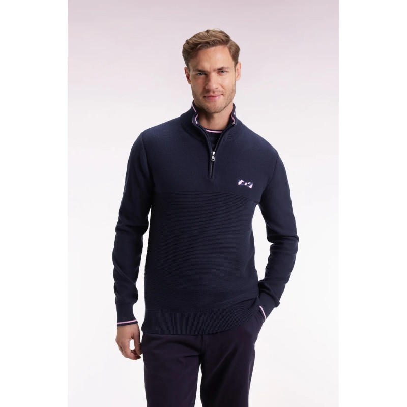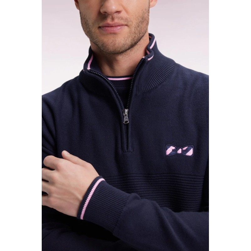 Adoptez l’élégance sportive avec ce pull Eden Park au col camionneur zippé. Son tricotage alternant points Ottoman et jersey crée un relief subtil, tandis que le liseré contrasté et le nœud papillon brodé avec tissu cravate rayé signent un style graphique et raffiné. Disponible en plusieurs coloris pour affirmer votre allure sans excès.
